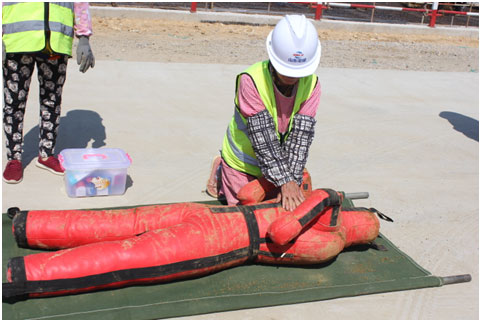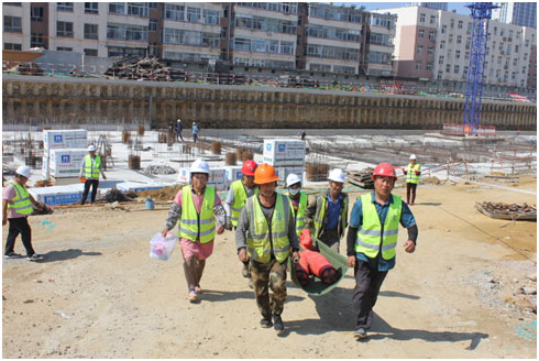 本次演練模擬為施工現(xiàn)場材料堆場出現(xiàn)火情和坍塌,施工人員發(fā)現(xiàn)后立即向項目經(jīng)理報告,項目經(jīng)理根據(jù)現(xiàn)場情況立即啟動應急預案。項目部全員按照應急預案進行疏散逃生。醫(yī)療救護組、安保組、綜合協(xié)調組等迅速集結,在做了緊急部署后,搶救傷員、滅火行動組同步行動,整個演練井然有序進行。